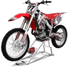 Risk Racing RR1 MX 450cc Dirt Bike Lift & Maintenance Stand Lifts 85CC - 450CC dirt bikes so that both tires are 5" to 16" off the ground for servicing, maintenance and even display. Single person operation, high quality construction, the 32" x 12" RR1 makes hoisting dirt bikes a breeze!